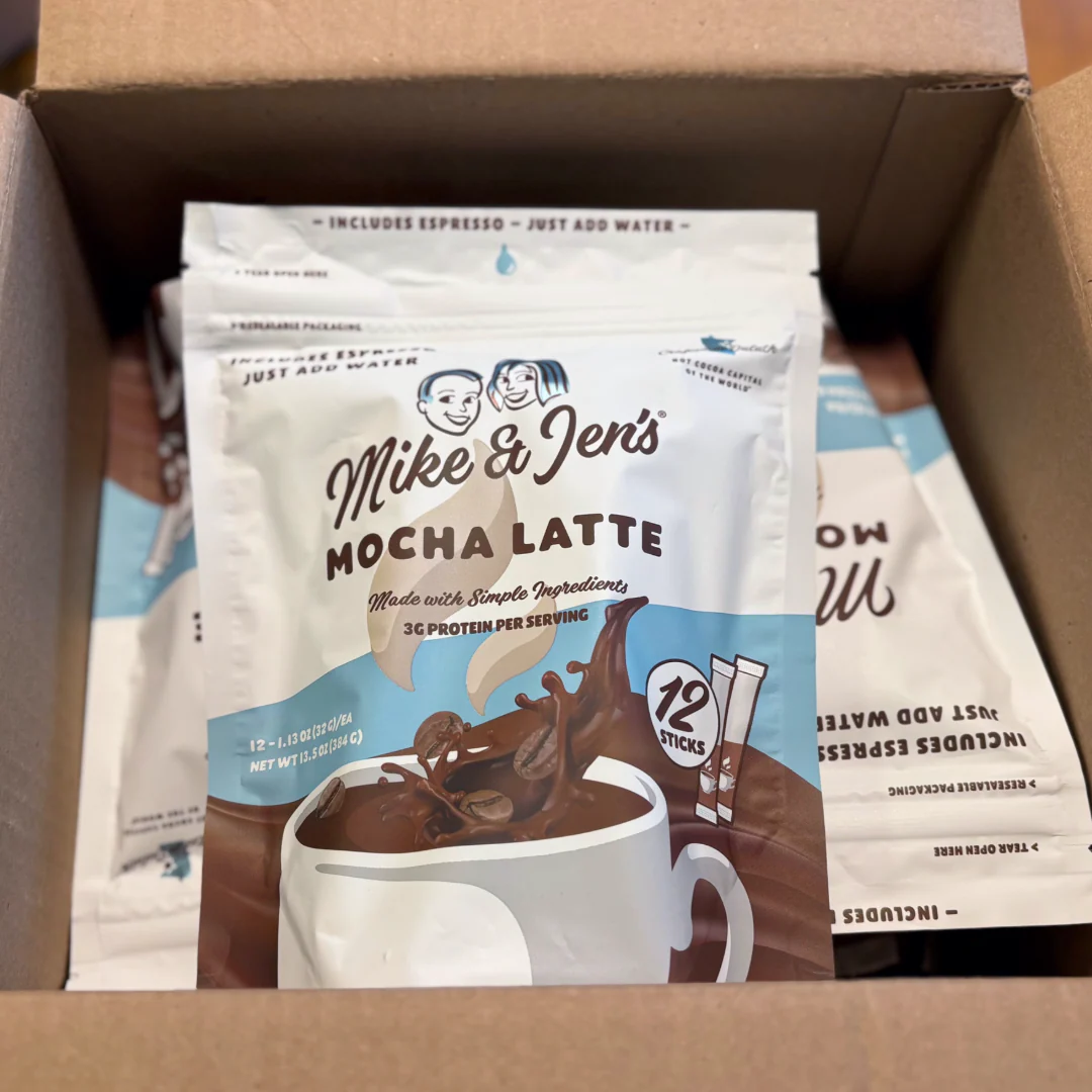 Mike and Jen's Cocoa Mix, now with added espresso for a rich and creamy instant MOCHA LATTE. Just add water!Â